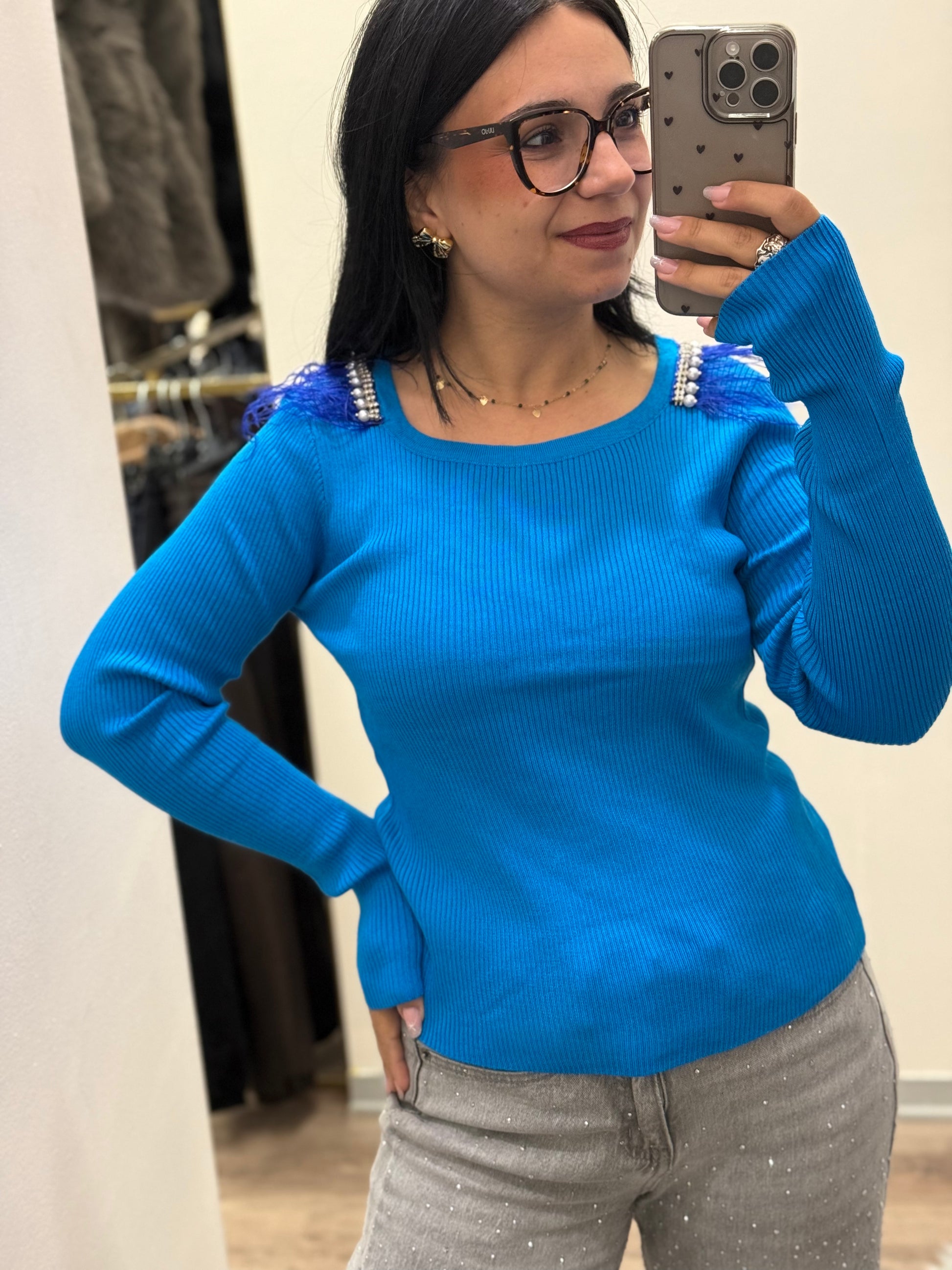 - Le piume e le perline danno un tocco di fantasia al maglioncino.