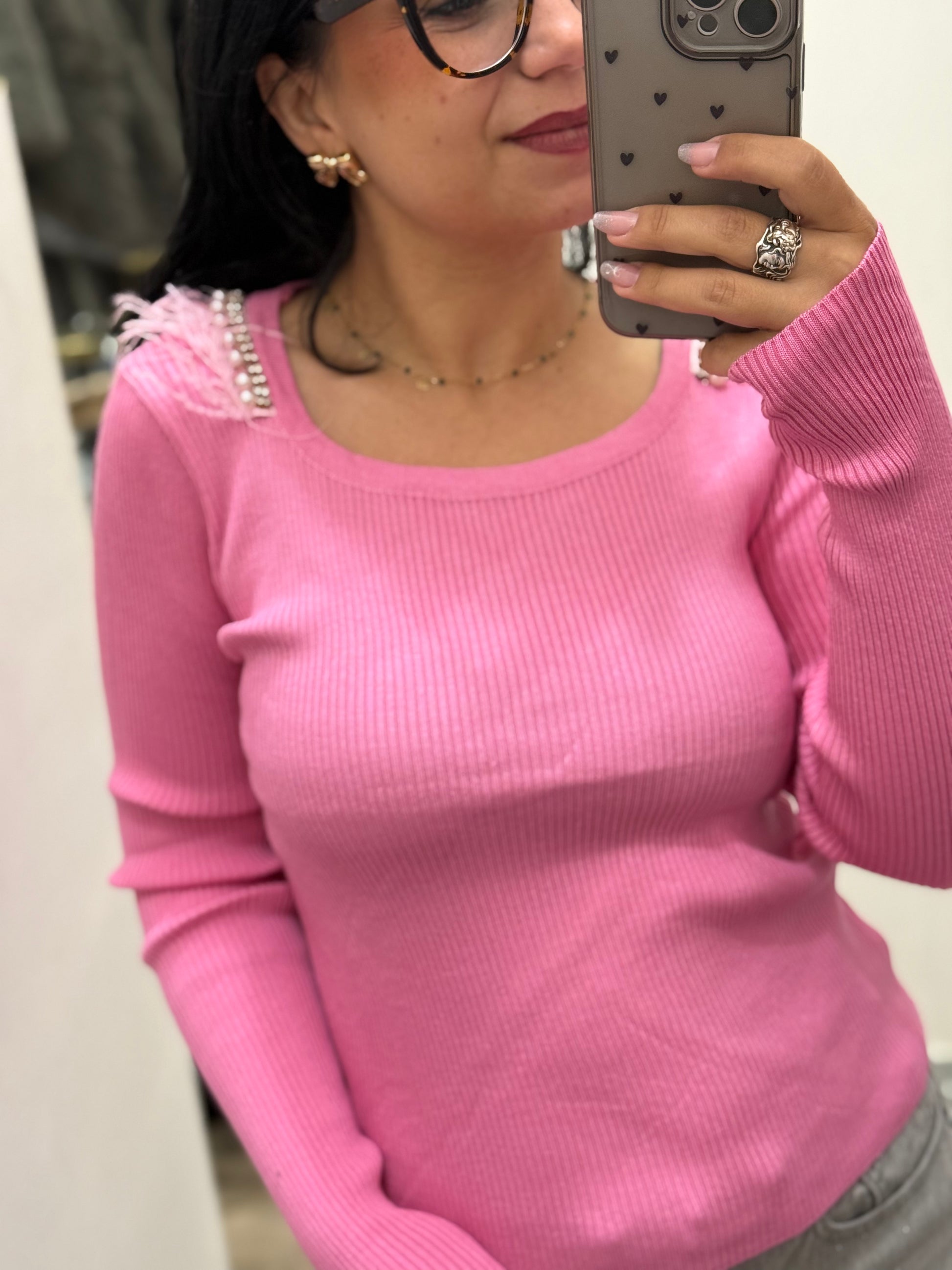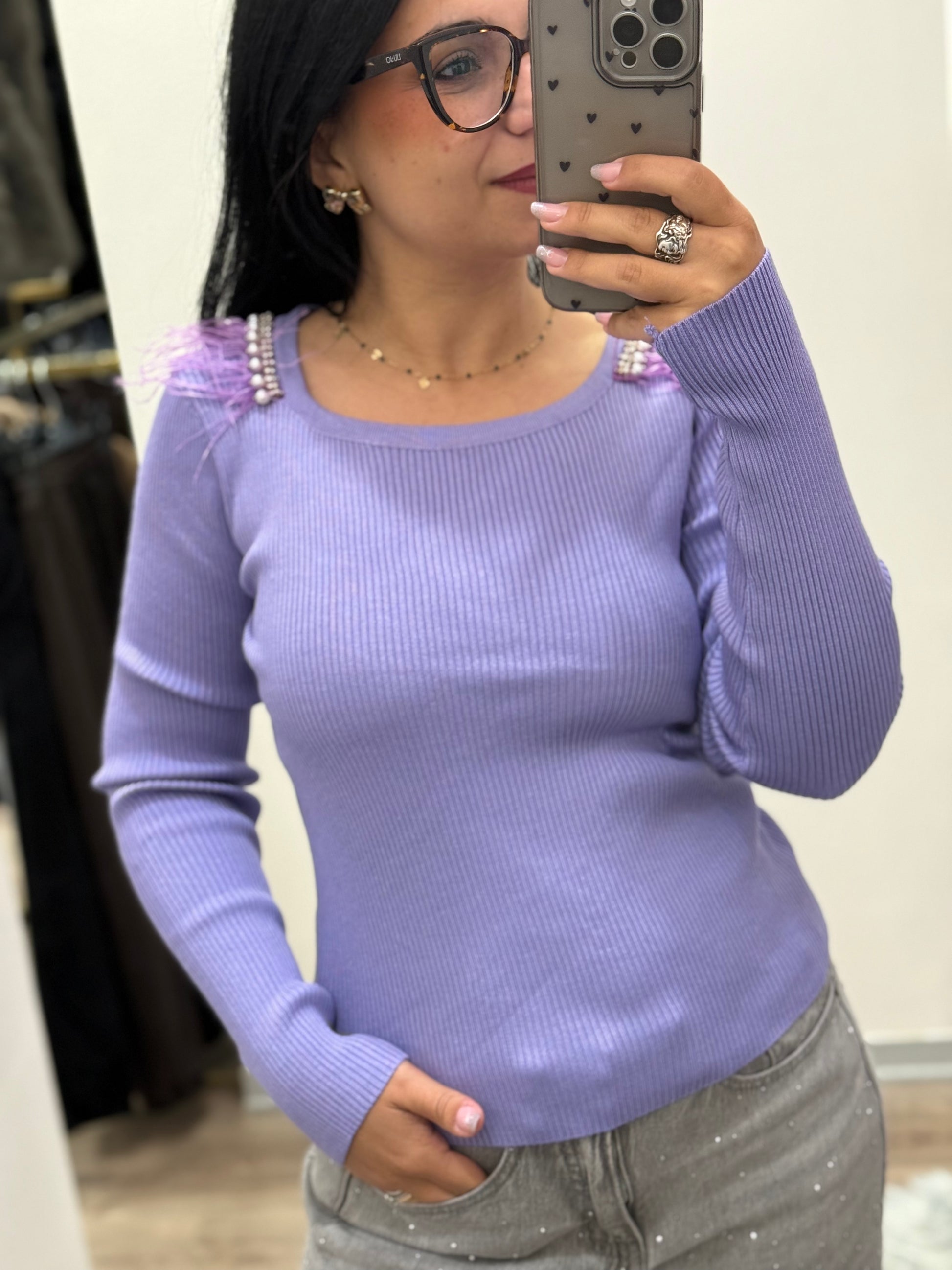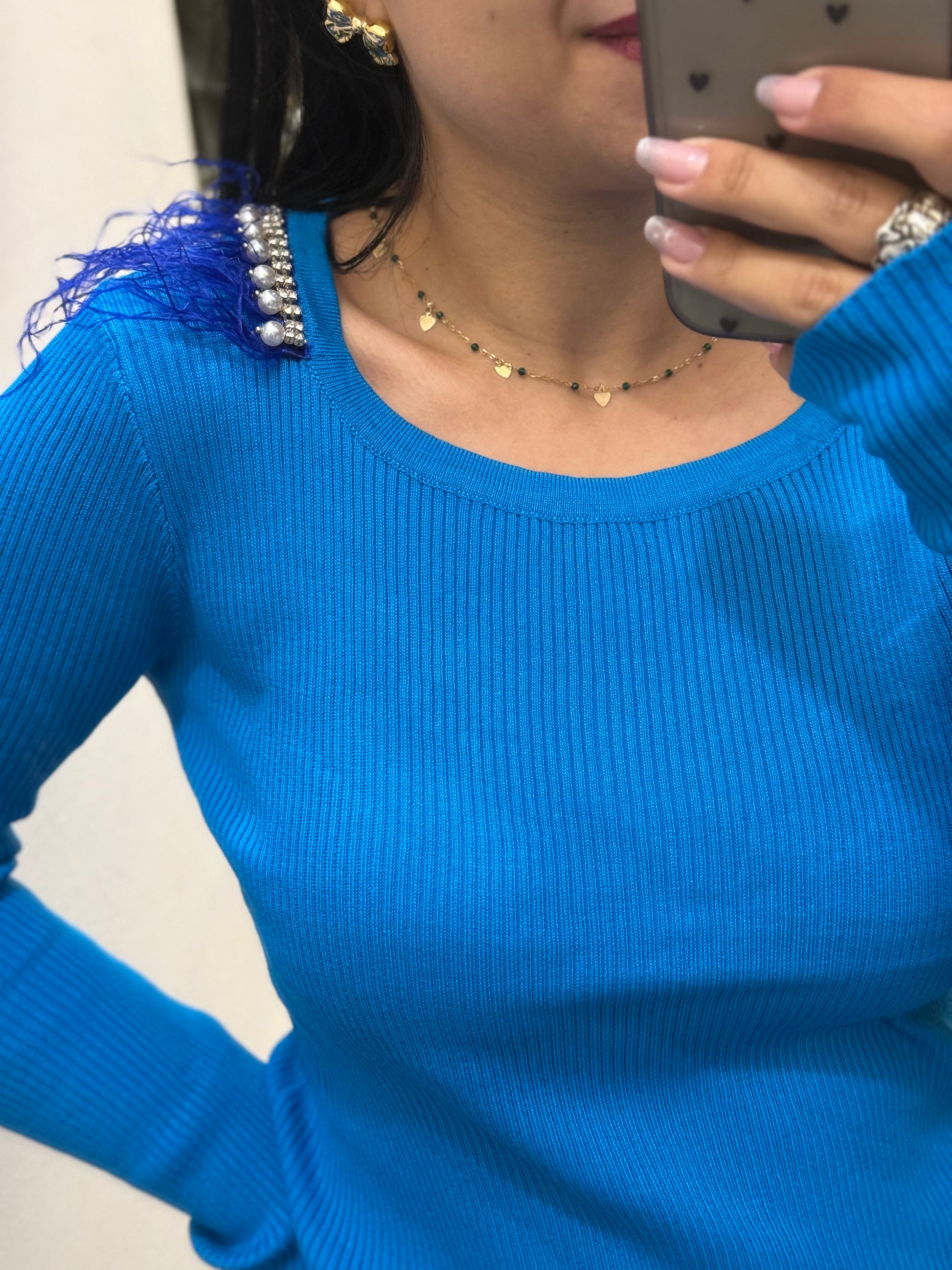 - Il maglioncino presenta un design a costine, arricchito con piume e perline.