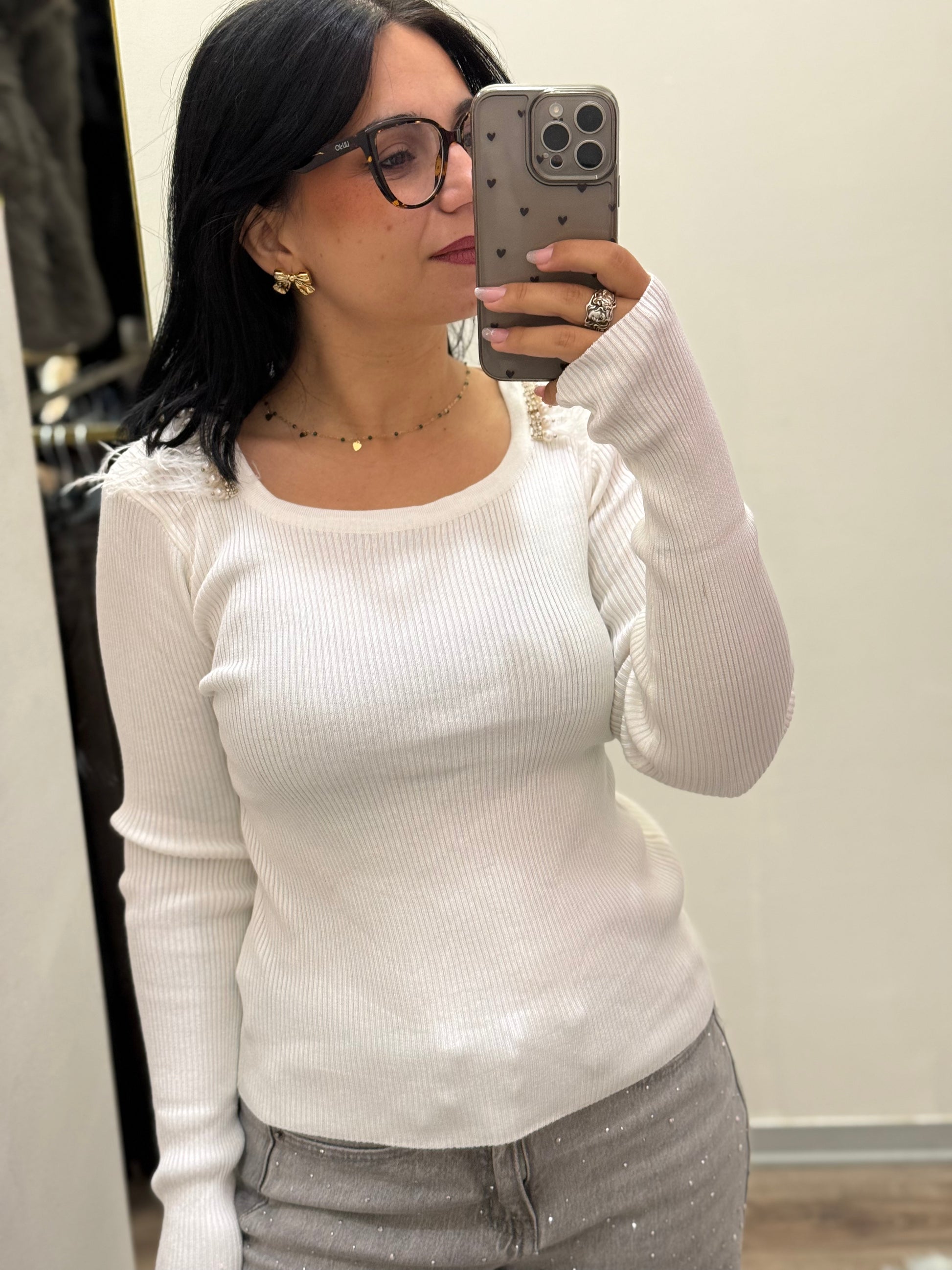 Maglioncino a costine con piume e perline